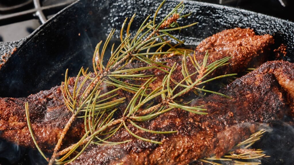 3. Place the tenderloin on a sheet pan. If you’re using pine, place a branch underneath and on top of each piece of meat. Cover with plastic wrap and let sit overnight in the fridge.